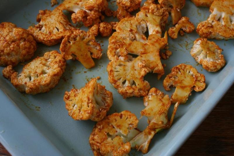 حضري صينية فرن واسعة ورصّي بها حبات القرنبيط، ثم اسكبي مزيج الثوم والبابريكا على وجه القرنبيط.