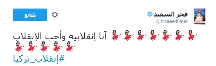 وقالت "فجر"، عبر حسابها الشخصي بموقع التواصل الاجتماعي «تويتر»، مساء اليوم: «وسمعونا "تسلم الأيادي" بالتركي ووراها "بشرة خير" وقوم نادي ع الإسطمبولي وابن اخوه الأنقراوي.. وهيييييييييه»، مضيفة: «أنا انقلابية وأحب الانقلاب».