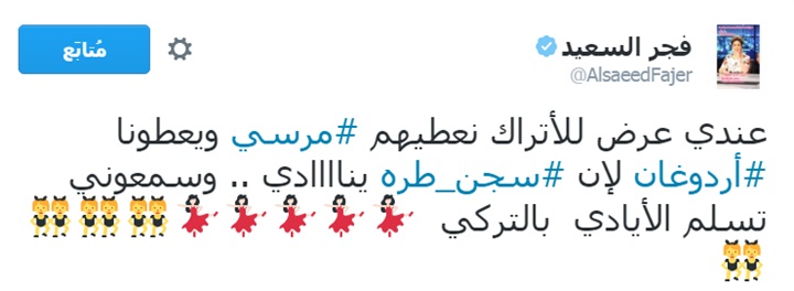 وأضافت الكاتبة الكويتية: «عندي عرض للأتراك، نعطيهم مرسي ويعطونا أردوغان؛ لأن سجن طره ينادي.. وسمعوني "تسلم الأيادي" بالتركي».