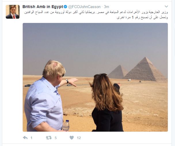 ونشر السفير البريطانى فى القاهرة جون كاسن، صورا لوزير الخارجية البريطانى من منطقة الإهرامات وعلق عليها بالقول: "وزير الخارجية يزور الأهرامات لدعم السياحة فى مصر، بريطانيا ثانى أكبر دولة أوروبية من عدد السياح الوافدين وتعمل على أن تصبح رقم 1 مرة أخرى".