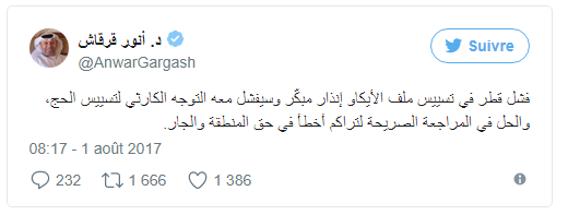 تجدر الإشارة إلى أن الأزمة الخليجية تسير نحو مزيد من التعقيد، بعد اتهام قطر للسعودية بتسييس قضية الحج، ورد السعودية على ذلك بأن "طلب قطر تدويل المشاعر المقدسة عدواني، وإعلان حرب على المملكة".