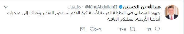 وغرد الملك عبد الله الثانى عبر صفحته الرسمية على موقع التواصل الاجتماعى "تويتر": "جهود الفيصلى في البطولة العربية لأندية كرة القدم تستحق التقدير وتضاف إلى منجزات أنديتنا الأردنية. يعطيكم العافية".