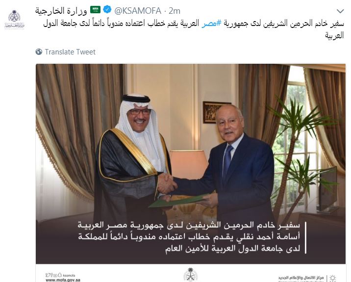 نشر الحساب الرسمى للسفارة السعودية فى القاهرة، عبر موقع "تويتر"، صورة لسفير خادم الحرمين الشريفين الجديد لدى مصر أسامة أحمد نقلى، خلال تقديم خطاب اعتماده مندوباً دائماً لدى جامعة الدول العربية.
