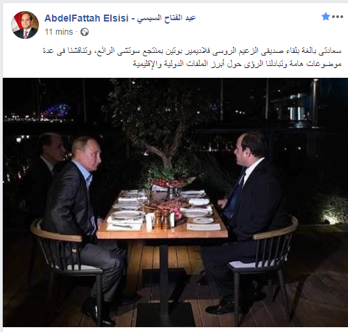 وقالت الصفحة الرسمية للرئيس عبر مواقع التواصل الاجتماعلى "سعادتى بالغة بلقاء صديقى الزعيم الروسى فلاديمير بوتين بمنتجع سوتشى الرائع، وتناقشنا فى عدة موضوعات هامة وتبادلنا الرؤى حول أبرز الملفات الدولية والإقليمية"