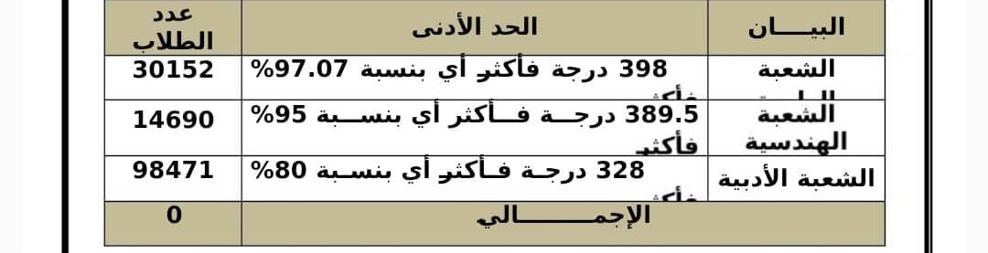 وجاء تنسيق المرحلة الأولى في علمي علوم يبدأ من 97.07 %، وعلمي رياضة من 95 %، والأدبي 80 % .
