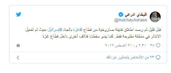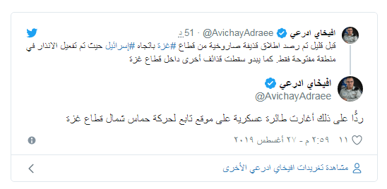 وكان أدرعي قال في بيان سابق إنه "تم رصد إطلاق قذيفة صاروخية من قطاع غزة باتجاه إسرائيل حيث تم تفعيل الإنذار في منطقة مفتوحة فقط".