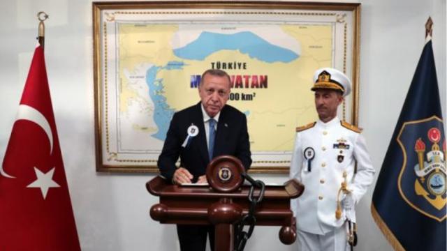 التقط الرئيس التركي رجب طيب أردوغان صورة أمام خريطة تركيا التي تشمل جزءا من بحر إيجه (أحد أفرع البحر المتوسط) والعديد من الجزر اليونانية في المنطقة الاقتصادية الخالصة التابعة لتركيا.