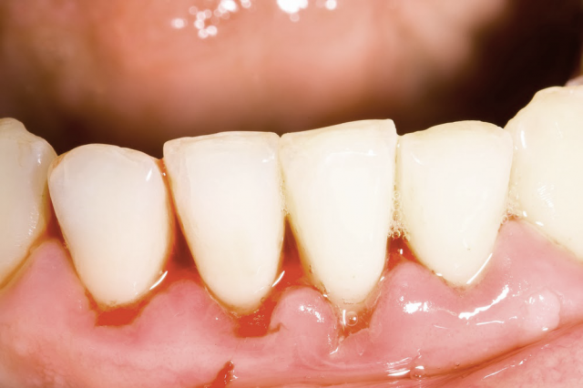 وأعراضها تهيج واحمرار وتورم وانتفاخ في اللثة ورائحة الفم الكريهة وانحسار اللثة وخاصة أثناء تنظيف الأسنان بالفرشاة أو الخيط.