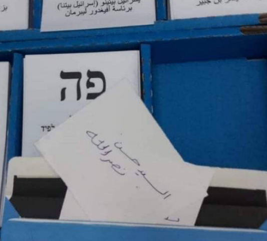 تداول مستخدمو وسائل التواصل الاجتماعي صورة تظهر ورقة كتب عليها اسم الأمين العام لـ "حزب الله" اللبناني، حسن نصرالله، خلال الانتخابات البرلمانية في إسرائيل.