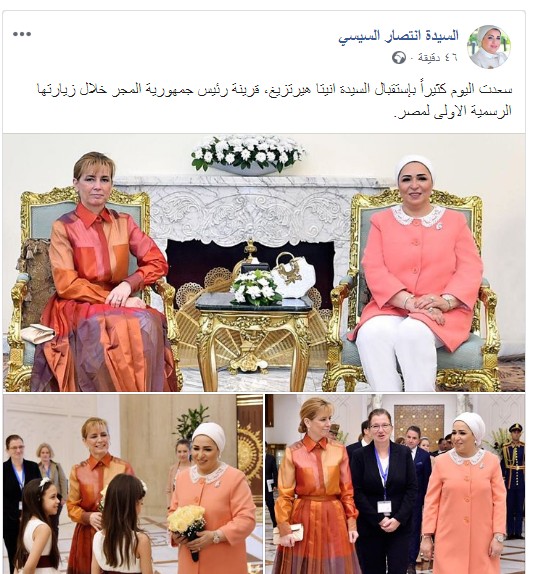 أعربت السيدة انتصار السيسي قرينة الرئيس عبد الفتاح السيسي، عبر صفحتها الرسمية على "فيسبوك"، عن سعادتها لاستقبالها قرينة رئيس جمهورية المجر خلال زيارتها الرسمية الأولى لمصر.
