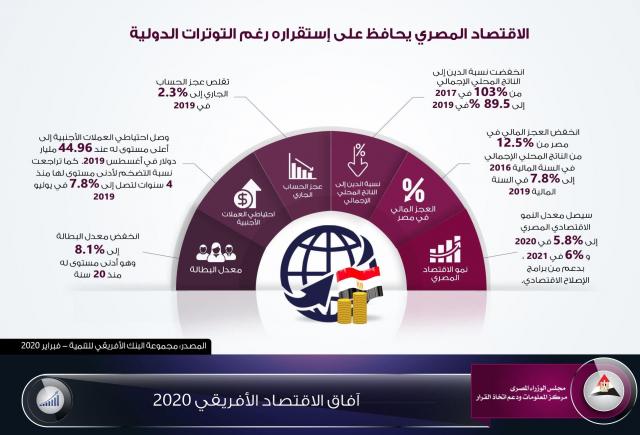 نشر مركز معلومات مجلس الوزراء انفوجراف سلط من خلاله الضوء على نجاح خطة الإصلاح الاقتصادى المصرى، حيث أكد أحدث تقرير صادر عن مجموعة البنك الأفريقى حفاظ الاقتصاد المصرى على استقراره رغم التوترات الدولية