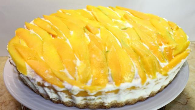 – نضع الكريمة على على احدى الصنيتين ونرص فوقها شرائح المانجو.
