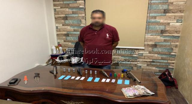عقب تقنين الإجراءات تم ضبطه بمسكنه.. وبحوزته (طبنجة- 3 فرد محلى الصنع- 10طلقات خرطوش- 2 سلاح أبيض - 104 قرص مخدر- مبلغ مالى- 2 هاتف محمول).