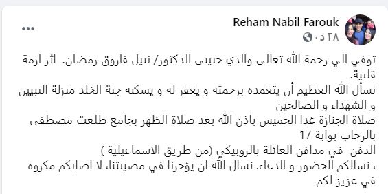 وكتبت ريهام ابنة الدكتور نبيل فاروق عبر حسابها الشخصي على فيسبوك، مساء اليوم :"توفي الي رحمة الله تعالى والدي حبيبى الدكتور/ نبيل فاروق رمضان.. اثر ازمة قلبية... نسأل الله العظيم أن يتغمده برحمته و يغفر له ويسكنه جنة الخلد منزلة النبيين والشهداء والصالحين".