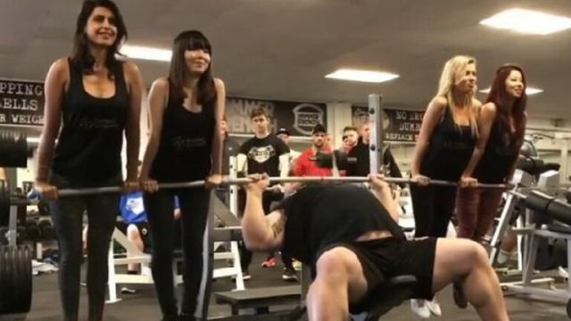 ويظهر في الفيديو البطل البريطاني وهو يرفع 4 فتيات بدلا من الأوزان في صالة اللياقة البدنية (الجيم).