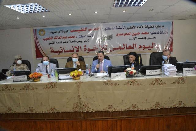 شارك اللواء عصام سعد محافظ أسيوط في الاحتفال الذي نظمته جامعة الأزهر فرع أسيوط باليوم العالمي للأخوة الإنسانية وذلك بقاعة المؤتمرات بكلية طب جامعة الأزهر تحت رعاية فضيلة الإمام الأكبر الدكتور أحمد الطيب شيخ الأزهر وفضيلة الأستاذ الدكتور محمد المحرصاوي رئيس الجامعة وذلك في ضوء قرار الأمم المتحدة باعتماد يوم ٤ من فبراير يوماً دوليًّا للأخوة الإنسانية بوصفه تتويجًا لجهود شيخ الأزهر وبابا الفاتيكان نحو نشر ثقافة السلام والأمن في مختلف دول العالم .. حضر الاحتفال الدكتور محمد عبدالمالك نائب رئيس الجامعة للوجه القبلي احتفالية والأنبا كيرلس وليم ممثل الكنيسة المصرية والعميد أركان حرب إيهاب مبروك مساعد قائد المنطقة الجنوبية العسكرية والدكتور شحاتة غريب نائب رئيس جامعة أسيوط ومها غانم نائب رئيس الجامعة لشئوةن البيئة وخدمة المجتمع والدكتور عاصم القبيصي وكيل وزارة الأوقاف بأسيوط والدكتور مصطفي شتات عميد كلية الطب وعبد الناصر بكر رئيس اتحاد عمال أسيوط والشيخ سيد عبدالعزيز أمين بيت العائلة المصرية بأسيوط.