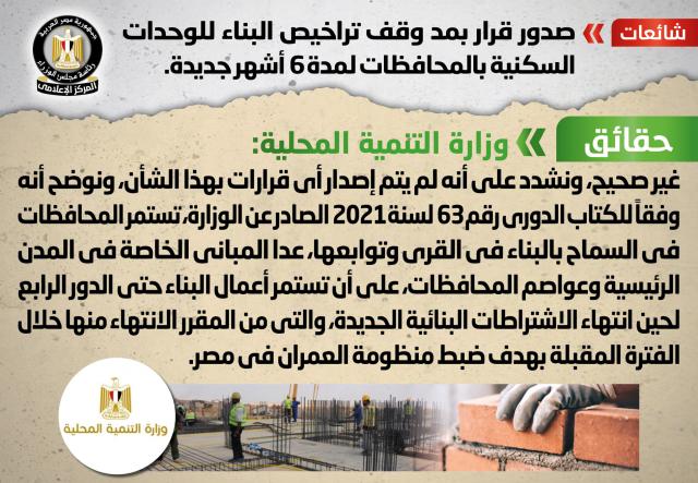 انتشر في بعض المواقع الإلكترونية وصفحات التواصل الاجتماعي أنباء بشأن صدور قرار بمد وقف تراخيص البناء للوحدات السكنية بالمحافظات لمدة 6 أشهر جديدة، وقد قام المركز الإعلامي لمجلس الوزراء بالتواصل مع وزارة التنمية المحلية، والتي نفت تلك الأنباء، مُؤكدةً أنه لا صحة لصدور قرار بمد وقف تراخيص البناء للوحدات السكنية بالمحافظات لمدة 6 أشهر جديدة، وأنه لم يتم إصدار أي قرارات بهذا الشأن، مُوضحةً أنه وفقاً للكتاب الدوري رقم 63 لسنة 2021 الصادر عن الوزارة، تستمر المحافظات في السماح بالبناء في القرى وتوابعها، عدا المباني الخاصة في المدن الرئيسية وعواصم المحافظات، على أن تستمر أعمال البناء حتى الدور الرابع لحين انتهاء الاشتراطات البنائية الجديدة، والتي من المقرر الانتهاء منها خلال الفترة المقبلة بهدف ضبط منظومة العمران في مصر.
