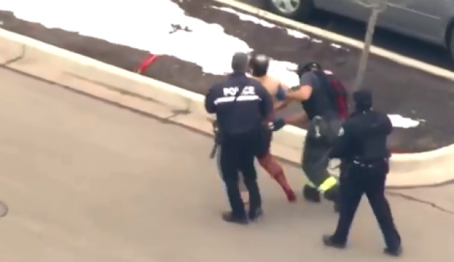 وأظهر مقطع فيديو من مكان الحادث بثته محطة التلفزيون المحلية "KDVR-TV"، رجلا ملتحيا بلا قميص يجري اقتياده مكبل اليدين، وشخصا على نقالة يجري نقله إلى سيارة إسعاف. وبدا أن ساق الرجل المقيد ملطخة بالدماء.