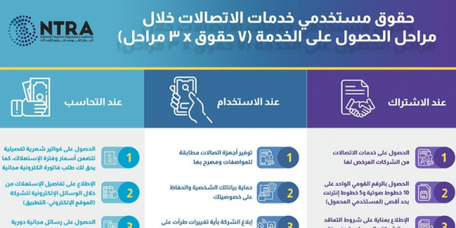 أصدر الجهاز القومي لتنظيم الاتصالات قائمة بأهم حقوق المستخدمين التي ألزم بها شركات الاتصالات العاملة بالسوق المصري، حيث جاءت القائمة موزعة على المراحل الثلاث لتلقي خدمات الاتصالات بهدف توعية المستخدمين بحقوقهم عند الاشتراك بالخدمة وعند استخدامها وأخيرًا بمرحلة التحاسب، وما تضمنته من التزامات على الشركات تتعلق بالأمور المالية كالشحن والفواتير ومتابعة الاستهلاك.