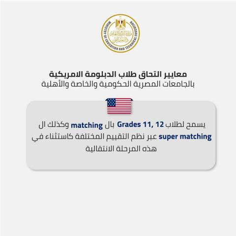 توضح وزارة التربية والتعليم والتعليم الفني معايير التحاق الطلاب الدارسين بنظام الدبلومة الامريكية بالجامعات المصرية الحكومية والخاصة والأهلية، في إطار التنسيق الكامل مع وزارة التعليم العالي: