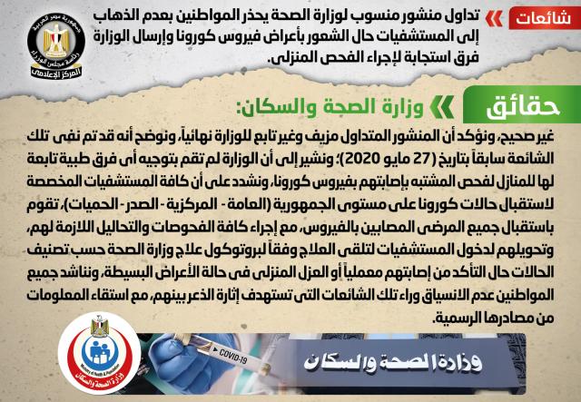 تداولت صفحات التواصل الاجتماعي منشوراً منسوباً لوزارة الصحة يحذر المواطنين بعدم الذهاب إلى المستشفيات حال الشعور بأعراض فيروس كورونا وإرسال الوزارة فرق استجابة لإجراء الفحص المنزلي، وقد قام المركز الإعلامي لمجلس الوزراء بالتواصل مع وزارة الصحة والسكان، والتي نفت تلك الأنباء، مُؤكدةً أنه لا صحة للمنشور المنسوب لوزارة الصحة الذي يحذر المواطنين بعدم الذهاب إلى المستشفيات حال الشعور بأعراض فيروس كورونا أو إرسال الوزارة فرق استجابة لإجراء الفحص المنزلي، وأن المنشور المتداول مزيف وغير تابع للوزارة نهائياً، مُوضحةً أنه قد تم نفي تلك الشائعة سابقاً بتاريخ (27مايو 2020)، مُشيرةً إلى أن الوزارة لم تقم بتوجيه أي فرق طبية تابعة لها للمنازل لفحص المشتبه بإصابتهم بفيروس كورونا، مُشددةً على أن كافة المستشفيات المخصصة لاستقبال حالات كورونا على مستوى الجمهورية (العامة - المركزية - الصدر - الحميات)، تقوم باستقبال جميع المرضى المصابين بالفيروس، مع إجراء كافة الفحوصات والتحاليل اللازمة لهم، وتحويلهم لدخول المستشفيات لتلقي العلاج وفقاً لبروتوكول علاج وزارة الصحة حسب تصنيف الحالات حال التأكد من إصابتهم معملياً أو العزل المنزلي في حالة الأعراض البسيطة، مُناشدةً جميع المواطنين عدم الانسياق وراء تلك الشائعات التي تستهدف إثارة الذعر بينهم، مع استقاء المعلومات من مصادرها الرسمية.