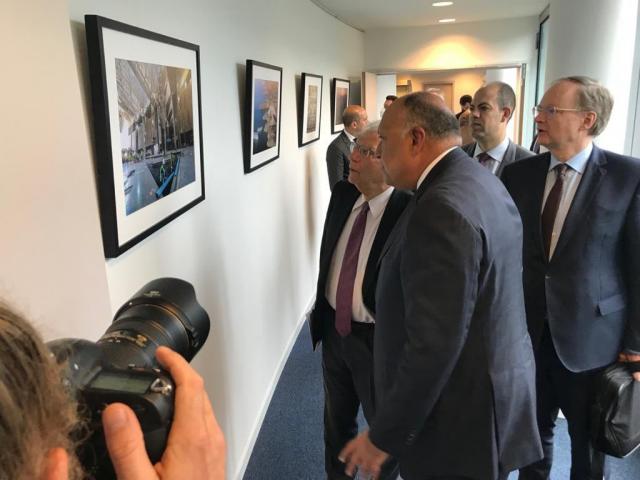 شكري وممثل السياسة الخارجية الأوروبي يتفقدان معرضا للصور حول الحضارة المصرية بمقر الاتحاد الأوروبي