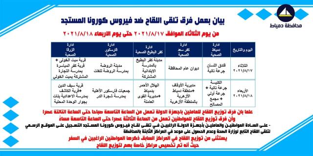 وتأتى محاور تلك الخطة خلال يومى الثلاثاء والأربعاء ١٨،١٧ أغسطس وفقاً لما هو موضوع بالجدول الآتى، علمًا بأن فرق توزيع اللقاح للعاملين بالجهاز الإدارى للدولة تعمل منذ الساعة التاسعة صباحًا حتى الساعة الثالثة عصرًا، كما تعمل فرق توزيع اللقاح للمواطنين من الثالثة عصرًا حتى التاسعة مساءً.