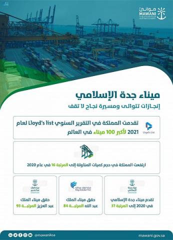 ووفقاً للتقرير؛ جاءت 3 موانئ سعودية ضمن أكبر 100 ميناء في العالم، حيث احتل ميناء الملك عبدالله المرتبة 84، فيما احتل ميناء الملك عبدالعزيز في المرتبة 93 عالمياً، ويأتي ذلك نتيجة لبرامج التطوير وعقود الإسناد التجاري التي أبرمتها الهيئة العامة للموانئ لرفع كفاءة تشغيل محطات الحاويات بميناء جدة الإسلامي، بعقود تمتد لـ 30 عاماً، وبقيمة استثمارات تناهز 9 مليارات ريال، وزيادة الطاقة الاستيعابية لمحطات الحاويات بأكثر من 70% لتصل إلى أكثر من 13 مليون حاوية.