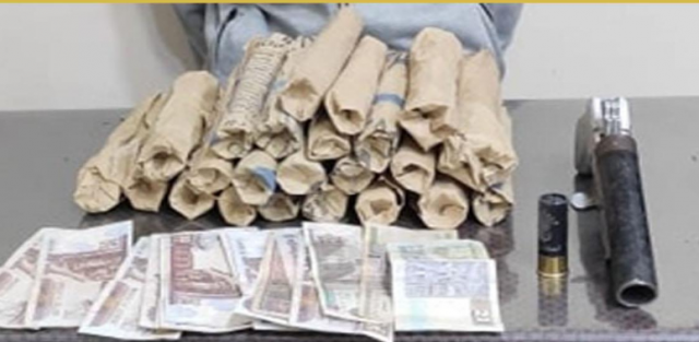 عقب تقنين الإجراءات بالتنسيق مع قطاع الأمن العام أمكن ضبطه بمحيط سكنه وبحوزته ( كمية من مخدر البانجو - فرد محلى - طلقة من ذات العيار – مبلغ مالى - هاتف محمول ) ، وبمواجهته إعترف بحيازته للمواد المخدرة بقصد الإتجار والسلاح النارى لحماية نشاطه الإجرامى ، والمبلغ المالى من متحصلات البيع والهاتف للإتصال بعملائه .
