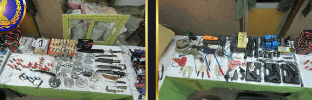 تمكنت قوة أمنية من قسم شرطة عابدين بمديرية أمن القاهرة والمعنية لملاحظة الحالة الأمنية لدائرة القسم من ضبط (أحد الأشخاص) ، وبحوزته (كرتونة بداخلها 230 قطعة سلاح أبيض "مطواة") ، وبمواجهته إعترف بتحصله عليهـا مـن (أحـد الأشـخاص – مقيم بمحافظة الجيزة( لشحنها لمحافظة بورسعيد نظير مبلغ مالى.