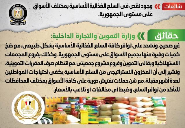 تداولت بعض وسائل الإعلام والمواقع الإلكترونية وصفحات التواصل الاجتماعي أنباء بشأن وجود نقص في السلع الغذائية الأساسية بمختلف الأسواق على مستوى الجمهورية، وقد قام المركز الإعلامي لمجلس الوزراء بالتواصل مع وزارة التموين والتجارة الداخلية، والتي نفت تلك الأنباء، مُؤكدةً أنه لا صحة لوجود نقص في السلع الغذائية الأساسية بأي من الأسواق على مستوى الجمهورية، مُشددةً على توافر كافة السلع الغذائية الأساسية بشكل طبيعي، مع ضخ كميات وفيرة منها بجميع الأسواق على مستوى الجمهورية، وكذلك بفروع المجمعات الاستهلاكية وبقالي التموين وفروع مشروع جمعيتي، مع انتظام صرف المقررات التموينية، مُشيرةً إلى أن المخزون الاستراتيجي من السلع الأساسية يكفي احتياجات المواطنين لعدة أشهر مقبلة، مع شن حملات تفتيش دورية على كافة الأسواق بمختلف المحافظات للتأكد من توافر السلع، وضبط أي مخالفات أو تلاعب بالأسعار.