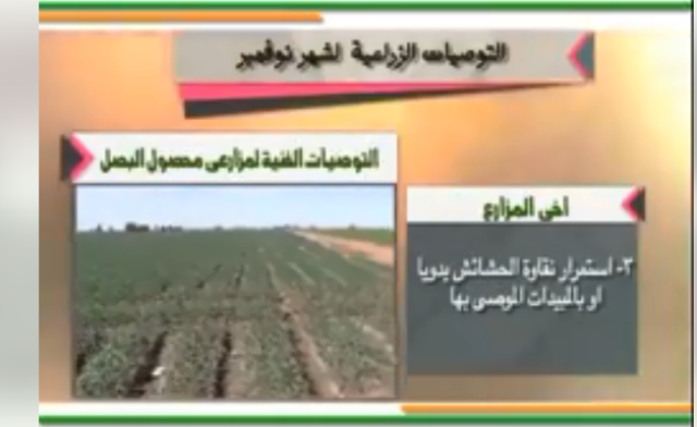 أصدرت وزارة الزراعة واستصلاح الأراضي، ممثلة في قطاع الارشاد الزراعي، نشرة بأهم التوصيات الفنية الواجب على مزارعي محصول البصل مراعاتها، خلال شهر نوفمبر: