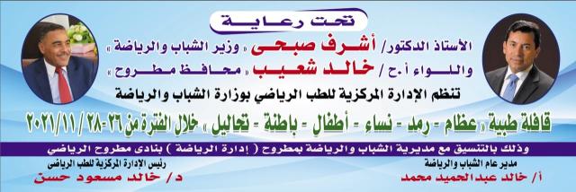 تنظم الإدارة المركزية للطب الرياضى بوزارة الشباب والرياضة قافلة طبية مجانية للكشف على الرياضيين بالأندية ومراكز الشباب وكذلك أهالى مطروح الكرام لمدة ثلاثة أيام فى الفترة من 26-28 نوفمير الجارى وذلك بقاعة نزل الشباب أمام مستشفى مطروح العسكرى
