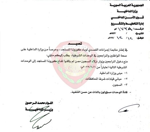 وجاء في تعميم لوزارة الداخلية السورية: "إنه في إطار متابعة إجراءات التصدي لوباء كورونا المستجد، وحرصا من وزارة الداخلية على صحة المواطنين والمراجعين في الوحدات الشرطية فإنه يطلب منهم بمنع دخول دخول المراجعين وزوار نزلاء السجون ممن لم يتلقوا لقاح كورونا المستجد إلى الوحدات الشرطية اعتباراً من 1-1-2021".