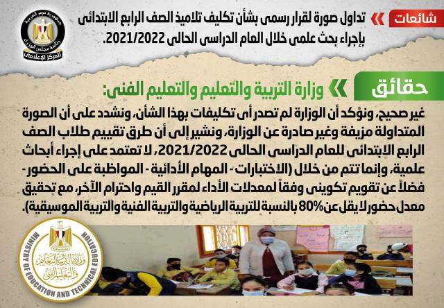 تداولت بعض المواقع الإلكترونية وصفحات التواصل الاجتماعي صورة لقرار رسمي بشأن تكليف تلاميذ الصف الرابع الابتدائي بإجراء بحث علمي خلال العام الدراسي الحالي 2021/2022، وقد قام المركز الإعلامي لمجلس الوزراء بالتواصل مع وزارة التربية والتعليم والتعليم الفني، والتي نفت تلك الأنباء، مُؤكدةً أنه لا صحة لتكليف تلاميذ الصف الرابع الابتدائي بإجراء بحث علمي خلال العام الدراسي الحالي 2021/2022، وأن الوزارة لم تصدر أي تكليفات بهذا الشأن، مُشددةً على أن الصورة المتداولة مزيفة وغير صادرة عن الوزارة، مُشيرةً إلى أن طرق تقييم طلاب الصف الرابع الابتدائي للعام الدراسي الحالي 2021/2022، لا تعتمد على إجراء أبحاث علمية، وإنما تتم من خلال (الاختبارات - المهام الأدائية - المواظبة على الحضور - فضلاً عن تقويم تكويني وفقاً لمعدلات الأداء، لمقرر القيم واحترام الآخر، مع تحقيق معدل حضور لا يقل عن 80% بالنسبة للتربية الرياضية والتربية الفنية والتربية الموسيقية).