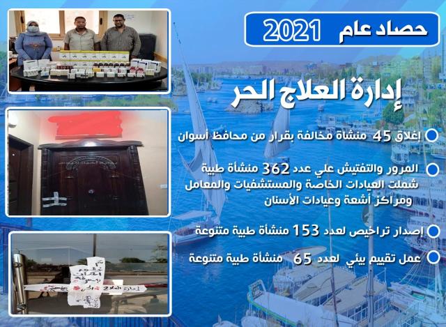 فى إطار متابعته للجهود التنفيذية المبذولة فى مختلف قطاعات العمل التنفيذى خلال العام الماضى ومنها قطاع الصحة أكد اللواء أشرف عطية محافظ أسوان على ضرورة الإستمرار فى تكثيف الحملات التفتيشية لرصد المخالفات أولاً بأول حفاظاً على صحة وسلامة المواطنين ، ومن جانبه أكدت الدكتور إيهاب حنفى وكيل وزارة الصحة بأن إدارة العلاج الحر والتراخيص بقيادة الدكتورة هبه سيد نجحت فى تنظيم حملات ميدانية للتفتيش على عدد 362 منشأة طبية متنوعة شملت العيادات الخاصة والمستشفيات والمعامل ومراكز أشعة وعيادات الأسنان ، بالإضافة إلى إصدار تراخيص لعدد 153 منشأة طبية مختلفة ، بجانب عمل تقييم بيئي لعدد 65 منشأة طبية أخرى، فضلاً عن إغلاق 45 منشأة مخالفة بقرار من محافظ أسوان .