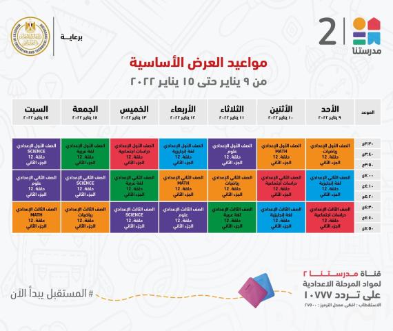 اعلنت وزارة التربية والتعليم مواعيد عرض البرامج التعليمية للمناهج المدرسية على قناة " مدرستنا ١، ٢" من ٩ يناير حتى ١٦ يناير بالإضافة إلى مواعيد الإعادة.