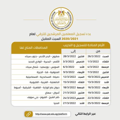 في إطار توجيهات الدكتور طارق شوقي وزير التربية والتعليم والتعليم الفني، أعلنت الوزارة، عن بدء تسجيل المعلمين المرشحين للترقى لعام 2020/2021 والذي يبلغ عددهم أكثر من 70000 "سبعون ألف" معلم، يوم السبت الموافق 26/2/2022، وذلك عبر منصة "المعلم" للتدريب عن بعد، عبر الرابط التالي: http://www.pat.edu.eg/platform