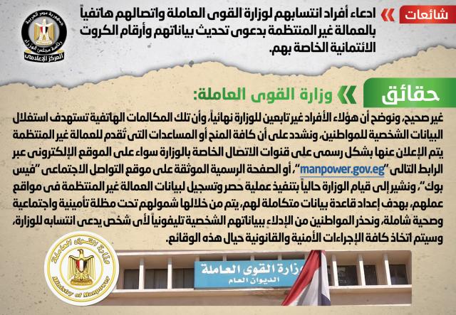 تداولت بعض المواقع الإلكترونية وصفحات التواصل الاجتماعي أنباء بشأن ادعاء أفراد انتسابهم لوزارة القوى العاملة واتصالهم هاتفياً بالعمالة غير المنتظمة بدعوى تحديث بياناتهم وأرقام الكروت الائتمانية الخاصة بهم، وقد قام المركز الإعلامي لمجلس الوزراء بالتواصل مع وزارة القوى العاملة، والتي نفت تلك الأنباء، مُؤكدةً أنه لا صحة لتوجيه الوزارة أي أفراد للتواصل هاتفياً مع العمالة غير المنتظمة بدعوى تحديث بياناتهم أو أرقام الكروت الائتمانية الخاصة بهم، مُوضحةً أن هؤلاء الأفراد غير تابعين للوزارة نهائياً، وأن تلك المكالمات الهاتفية تستهدف استغلال البيانات الشخصية للمواطنين، مُشددةً على أن كافة المنح أو المساعدات التي تُقدم للعمالة غير المنتظمة يتم الإعلان عنها بشكل رسمي على قنوات الاتصال الخاصة بالوزارة سواء على الموقع الإلكتروني عبر الرابط التالي "manpower.gov.eg"، أو الصفحة الرسمية الموثقة على موقع التواصل الاجتماعي "فيس بوك"، مُشيرةً إلى قيام الوزارة حالياً بتنفيذ عملية حصر وتسجيل لبيانات العمالة غير المنتظمة في مواقع عملهم، بهدف إعداد قاعدة بيانات متكاملة لهم، يتم من خلالها شمولهم تحت مظلة تأمينية واجتماعية وصحية شاملة، مُحذرةً المواطنين من الإدلاء ببياناتهم الشخصية تليفونياً لأي شخص يدعي انتسابه للوزارة، وسيتم اتخاذ كافة الإجراءات الأمنية والقانونية حيال هذه الوقائع.