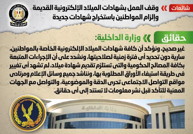 تداولت بعض المواقع الإلكترونية وصفحات التواصل الاجتماعي أنباء بشأن وقف العمل بشهادات الميلاد الإلكترونية القديمة وإلزام المواطنين باستخراج شهادات جديدة، وقد قام المركز الإعلامي لمجلس الوزراء بالتواصل مع وزارة الداخلية، والتي نفت تلك الأنباء، مُؤكدةً أنه لا صحة لوقف العمل بشهادات الميلاد الإلكترونية القديمة وإلزام المواطنين باستخراج شهادات جديدة، مُؤكدةً أن كافة شهادات الميلاد الإلكترونية الخاصة بالمواطنين، سارية دون تحديد أي فترة زمنية لصلاحيتها، مُشددةً على أن الإجراءات المتبعة بكافة المصالح الحكومية والتي تستلزم تقديم شهادة ميلاد، لم تشهد أي تغيير في طريقة استيفاء الأوراق المطلوبة بها، مُناشدةً جميع وسائل الإعلام ومرتادي مواقع التواصل الاجتماعي تحري الدقة والموضوعية، والتواصل مع الجهات المعنية للتأكد قبل نشر معلومات لا تستند إلى أي حقائق.