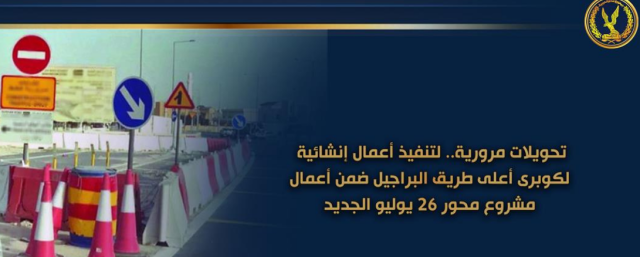 تقوم الإدارة العامة لمرور الجيزة بتعيين الخدمات المرورية اللازمة لمواجهة أى كثافات مرورية متوقعة ، وتسيير حركة المرور ، وذلك تزامناً مع البدء فى تنفيذ الأعمال الإنشائية لكوبرى أعلى طريق البراجيل ضمن أعمال مشروع محور 26 يوليو الجديد مما يستلزم غلق كلى لطريق البراجيل أمام حركة المرور تحديداً فى الإتجاه القادم من أسفل الطريق الدائرى إتجاه مناطق كوبرى المطار ومحور أحمد عرابى "فقط" لمسافة ما يقرب من (600 متر) ، وذلك إعتباراً من الساعة الـ 1 صباح يوم الإثنين الموافق 9/5/2022 حتى الإنتهاء من الأعمال .