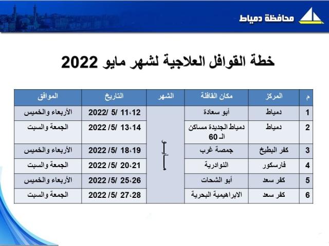 تستهدف الخطة تنفيذ قافلة طبية بقرية أبو سعادة الصغرى بمركز كفر سعد بدأت أمس وتستمر حتى اليوم الخميس ،وإنطلاق قافلة بمساكن الـ٦٠ بمدينة دمياط الجديدة يومي الجمعة والسبت (١٤،١٣ مايو) وأخرى بقرية جمصة غرب بمركز كفر البطيخ يومي الأربعاء والخميس الموافقين (١٩،١٨ مايو).