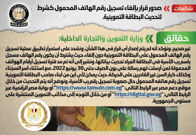 انتشر في بعض المواقع الإلكترونية وصفحات التواصل الاجتماعي أنباء بشأن صدور قرار بإلغاء تسجيل رقم الهاتف المحمول كشرط لتحديث البطاقة التموينية، وقد قام المركز الإعلامي لمجلس الوزراء بالتواصل مع وزارة التموين والتجارة الداخلية، والتي نفت تلك الأنباء، مُؤكدةً أنه لا صحة لإلغاء تسجيل رقم الهاتف المحمول كشرط لتحديث البطاقة التموينية، وأنه لم يتم إصدار أي قرار في هذا الشأن، مشددةً على استمرار تطبيق عملية تسجيل رقم الهاتف المحمول على البطاقة التموينية دون إلغاء، حيث يشترط أن يكون رقم الهاتف مسجل باسم رب الأسرة في البطاقة المراد تحديث بياناتها، مُشيرةً إلى أنه تم مد فترة تسجيل أرقام الهواتف المحمولة لمن أرسلت لهم رسالة على بون الصرف حتى 30 يونيو 2022، مع استثناء أسر السجناء وكذلك كبار السن غير القادرين على الحركة، حيث يمكن لأي ابن من أبناء صاحب البطاقة التموينية تسجيل رقم هاتفه المحمول حال صعوبة تسجيل رقم رب الأسرة، موضحةً أنه يتم التحديث من خلال موقع دعم مصر عبر الرابط التالي: "https://www.tamwin.com.eg" أو بوابة مصر الرقمية عبر الرابط التالي: "https://digital.gov.eg" أو من خلال التوجه إلى مكاتب التموين المنتشرة على مستوى الجمهورية.