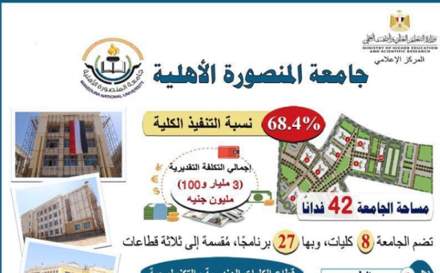 وصرح د. عادل عبدالغفار المُستشار الإعلامي والمُتحدث الرسمي للوزارة، أن الجامعة تُقام على مساحة 42 فدانًا، ومقرها مدينة جمصة بمحافظة الدقهلية، وبتكلفة تقديرية تبلغ 3 مليار و100 مليون جنيه، لافتًا إلى أن الجامعة حققت معدلات تنفيذ بلغت 68.4%، مضيفًا أن جامعة المنصورة الأهلية تعد نموذجًا دوليًا معاصرًا لجامعات الجيل الرابع التي تُسهم في إتاحة تعليم مُتميز، من خلال تقديم برامج تعليمية مُتميزة تواكب العصر، وتعمل على تأهيل خريجين قادرين على المُنافسة في أسواق العمل المُختلفة.
