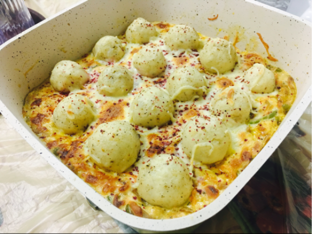 حضري طبق البايركس وضعي الدجاج وفوقها برش الجبن، ثم قومي بصنع كرات من خليط البطاطس ووزعيها فوق طبقة الدجاج، ومن ثم الصوص وبرش الجبن.