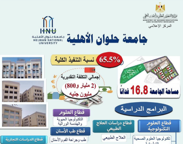 وصرح د.عادل عبدالغفار المُستشار الإعلامي والمُتحدث الرسمي لوزارة التعليم العالي والبحث العلمي بوجود انتظام معدلات الأداء التنفيذى بجامعة حلوان الأهلية، والتى تبلغ مساحتها 16.8 فدانًا، بتكلفة إجمالية تقدر 2 مليار و800 مليون جنيه، وتضم 8 كليات أبرزها؛ (كلية تكنولوجيا العلوم الصحية التطبيقية، والفنون والفنون التطبيقية، والعلوم الإنسانية والتجارة وإدارة الأعمال، العلاج الطبيعي، علوم الحاسب وتكنولوجيا المعلومات)، ووصلت معدلات الأداء التنفيذى بالجامعة إلى نسبة 65.5%.