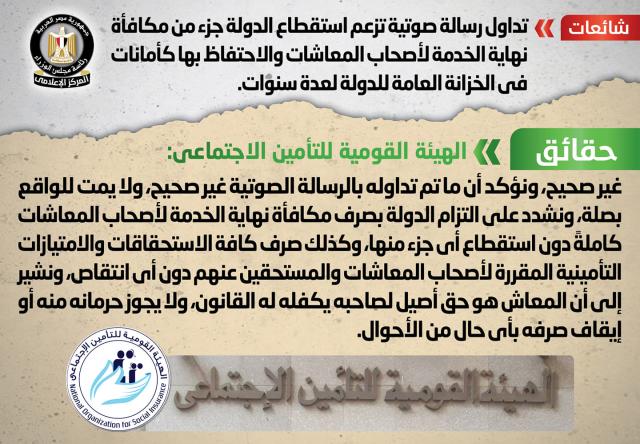 تداولت بعض مواقع التواصل الاجتماعي رسالة صوتية تزعم استقطاع الدولة جزء من مكافأة نهاية الخدمة لأصحاب المعاشات والاحتفاظ بها كأمانات في الخزانة العامة للدولة لعدة سنوات، وقد قام المركز الإعلامي لمجلس الوزراء بالتواصل مع الهيئة القومية للتأمين الاجتماعي، والتي نفت تلك الأنباء، مُؤكدةً أنه لا صحة لاستقطاع أي جزء من مكافأة نهاية الخدمة لأصحاب المعاشات أو الاحتفاظ بها كأمانات في الخزانة العامة للدولة لعدة سنوات، وأن ما تم تداوله بالرسالة الصوتية غير صحيح ولا يمت للواقع بصلة، مُشددةً على التزام الدولة بصرف مكافأة نهاية الخدمة لأصحاب المعاشات كاملةً دون استقطاع أي جزء منها، وكذلك صرف كافة الاستحقاقات والامتيازات التأمينية المقررة لأصحاب المعاشات والمستحقين عنهم دون أي انتقاص، مشيرةً إلى أن المعاش هو حق أصيل لصاحبه يكفله له القانون، ولا يجوز حرمانه منه أو إيقاف صرفه بأي حال من الأحوال.