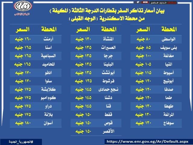 اسعار تذاكر السفر بقطارات الدرجة الثالثة المكيفة من الإسكندرية لمحطات الوجهة القبلى