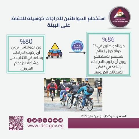نشر مركز المعلومات ودعم اتخاذ القرار بمجلس الوزراء انفوجراف عبر صفحته الرسمية على موقع التواصل الاجتماع فيس بوك حول استخدام المواطنين للدراجات كوسيلة للحفاظ على البيئة .