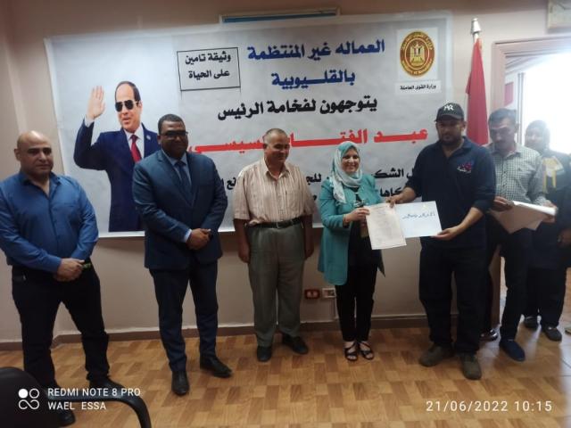 أناب محمد سعفان وزير القوى العاملة، إيمان شحاته مدير مديرية القوي العاملة بمحافظة القليوبية بتسليم 152 وثيقة للتأمين ضد الحوادث الشخصية للعمالة غير المنتظمة "الدفعة الثانية" من المسجلة بالمديرية تغطي الوفاة، والعجز الكلى المستديم، والجزئي، تنفيذا لمبادرة "حياة كريمة"، التي أطلقها الرئيس عبد الفتاح السيسي.